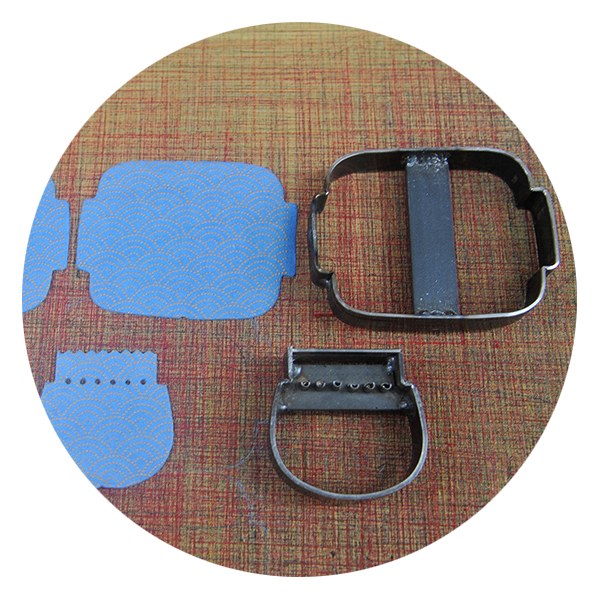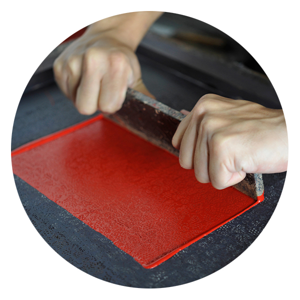 創業者より代々受け継がれてきた大小様々なヘラを使用し、製品の大きさに合わせて一枚一枚丁寧に漆を付けていきます。 模様付けには型紙を使用します。