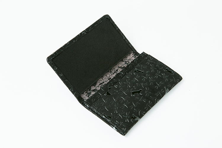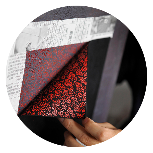 甲州印伝の模様は漆を硬化させてできています。 古来より日本の美意識を表現するのに使われていた漆は、甲州印伝でもその魅力を発揮しています。 革の上にぷっくりと盛り上がった艶やかな漆は、他の革製品にはない独特の手触りと魅力を醸し出しています。
