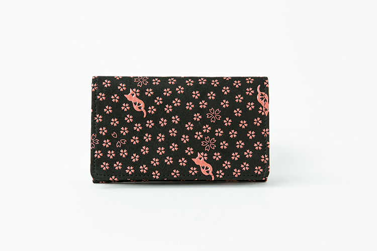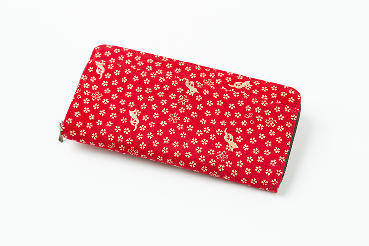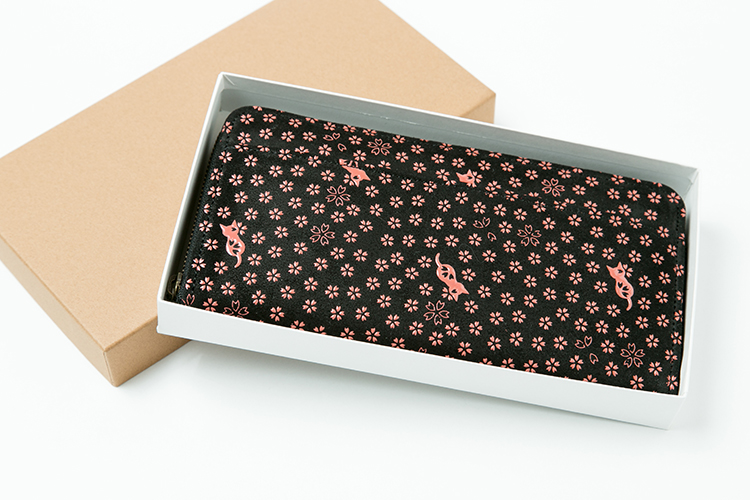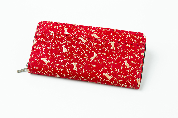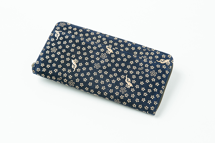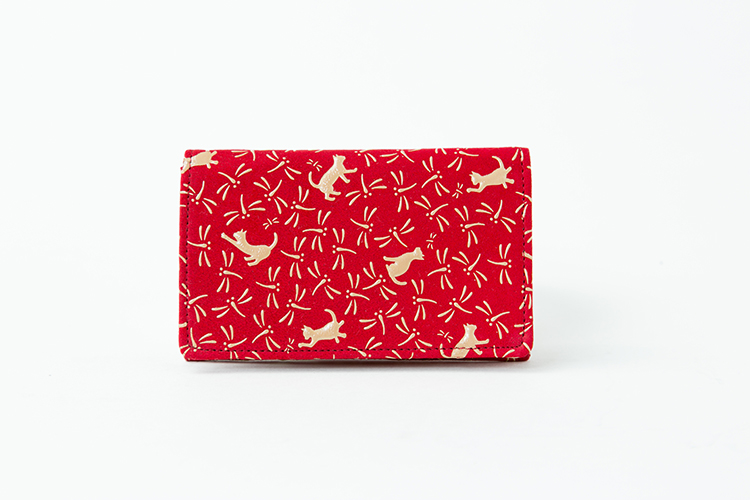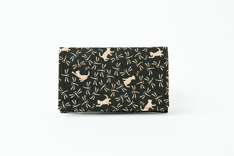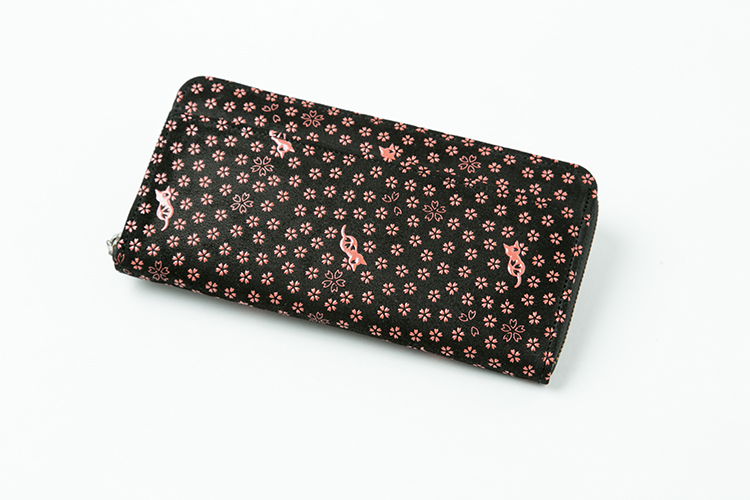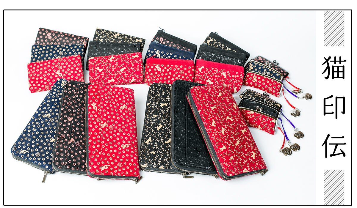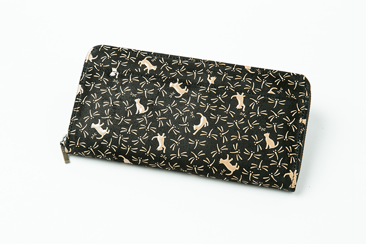 勝招猫(猫×トンボ)と彩夢(猫×桜)の二柄。 ラインナップは、それぞれ長財布、名刺入れ、小銭入れ、印章ケースの合計4種類。