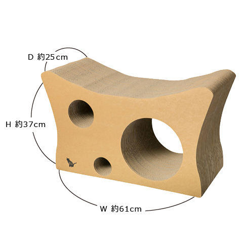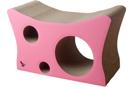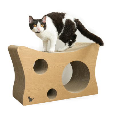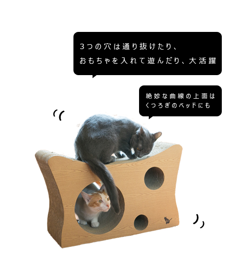 爪とぎはもちろん、横の穴にオモチャを入れて遊んだり、トンネル遊びをしたり、上部の絶妙なカーブはくつろぎのベッドに… 。